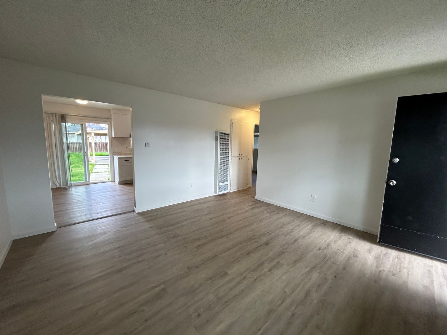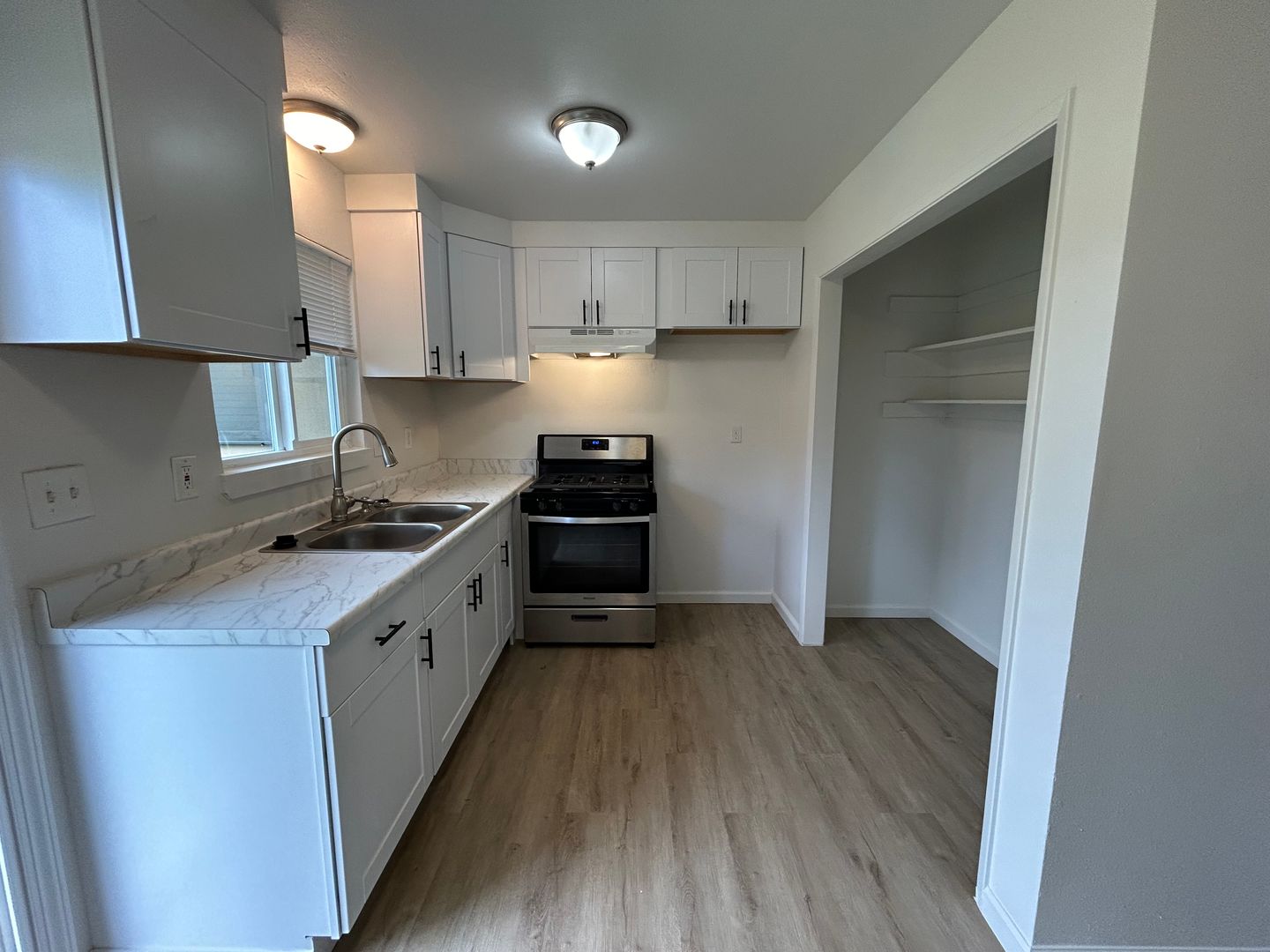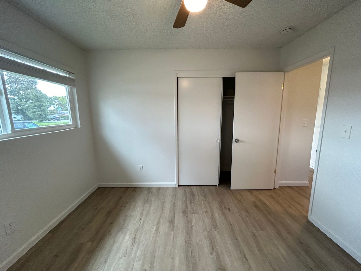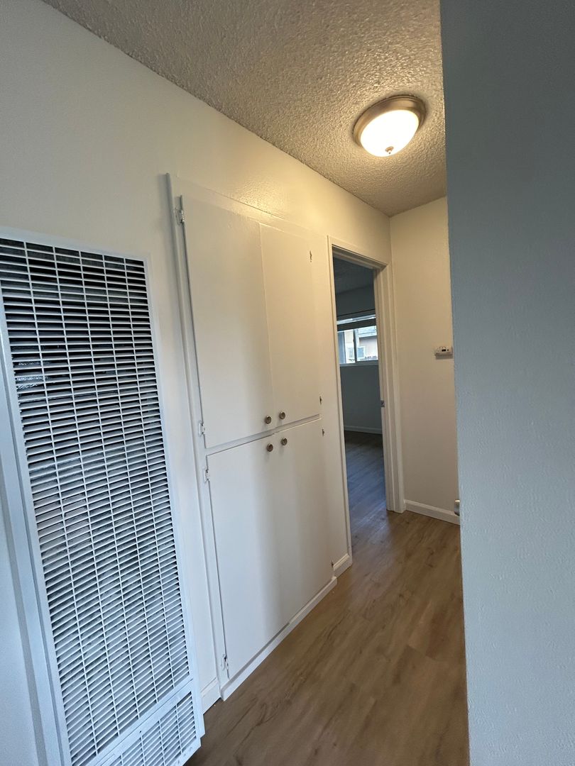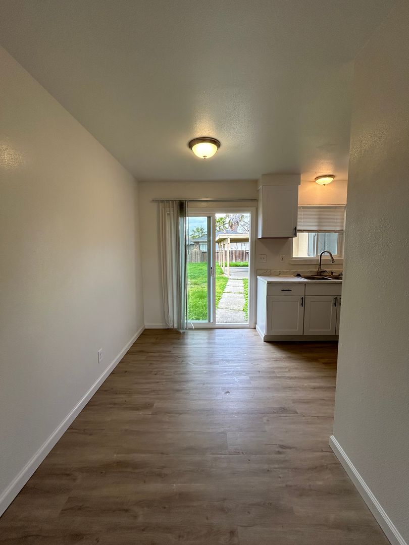 This remodeled unit has approximately 765 square feet with living room, laminate flooring throughout, gas range, blinds throughout, wall heating & window air conditioning, ceiling fans, laundry area w/hookups, off-street parking, shared backyard. Close to schools, parks, & shopping. Take W Briggsmore Ave to right Carver Rd, right at Evergreen Ave. No pets. Water/Sewer Paid. L/D