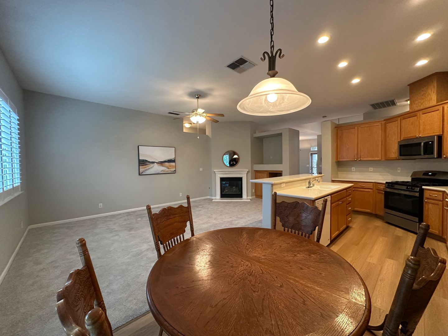 This single-family home has was built in 2003, approximately 2,115 square feet with a separate family room and living room, formal dining area, laminate flooring, carpets, plantation shutters, Corian countertops, gas range, dishwasher, microwave, refrigerator, garbage disposal, central heating and air conditioning, gas fireplace, inside laundry room w/ washer and dryer included, two-car car garage, front & backyard landscaped w/ automatic sprinklers, covered patio. Close to schools, parks, and shopping. Located E Louise Ave to Pestana Ave right at Treeline Way. Renter's Insurance Required. One Year Lease Required. Pets very strictly negotiable. Wall decor and dining table/chairs are included, all other furnishing are not included. Zillow rental applications are not accepted.